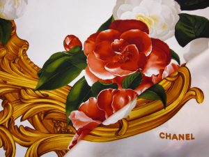 Chanel 1990’s gold, red and cream camellia print scarf. Measures 38″². Sold