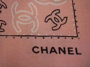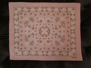 Chanel pink cotton logo print bandana. Measures 24½” x 19″.
