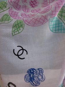 Chanel sheer cotton camellia print pareo. As is. Measures 60″ x 40″. Sold