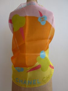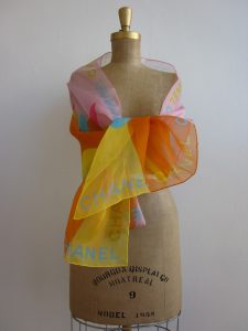 Chanel citrus print, silk organza wrap/scarf. Measures 62″ x 26″. Sold