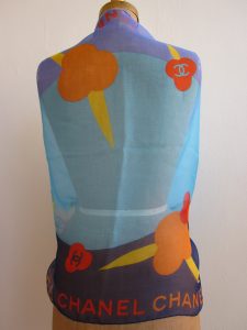 Chanel blue print, silk gauze wrap/scarf. Measures 61″ x 26″. Sold